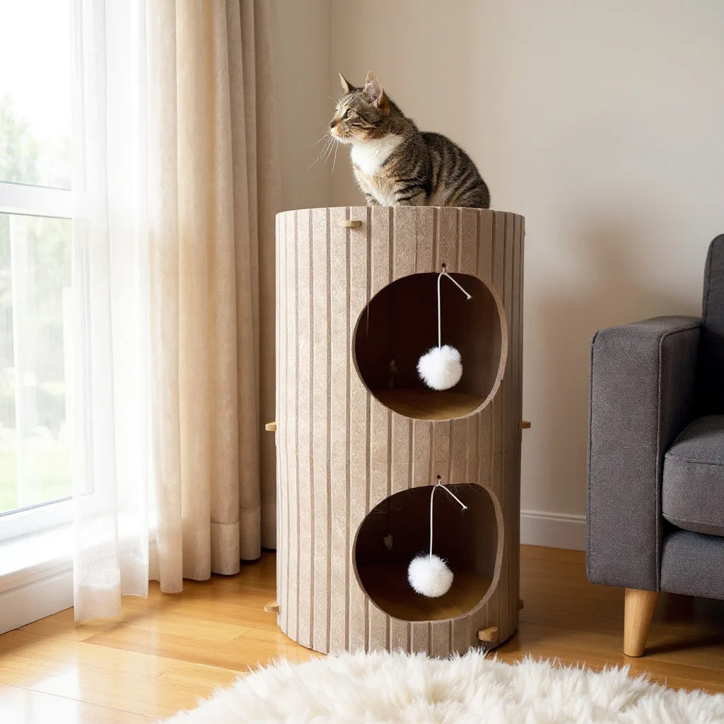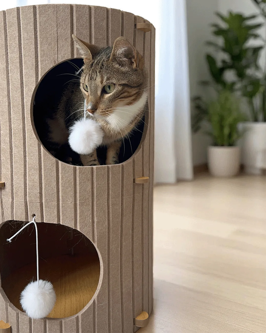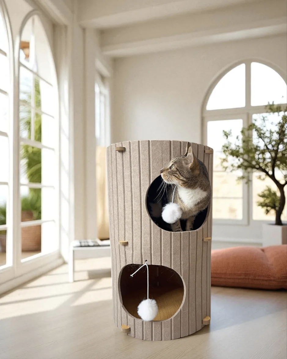 La Casa de Fieltro Mediterráneo es un espacio acogedor y estilizado que brinda a tu gato privacidad, calidez y seguridad. Fabricada con tablero de alta densidad y recubierta de suave fieltro, esta casa combina diseño moderno y funcionalidad en un solo producto.