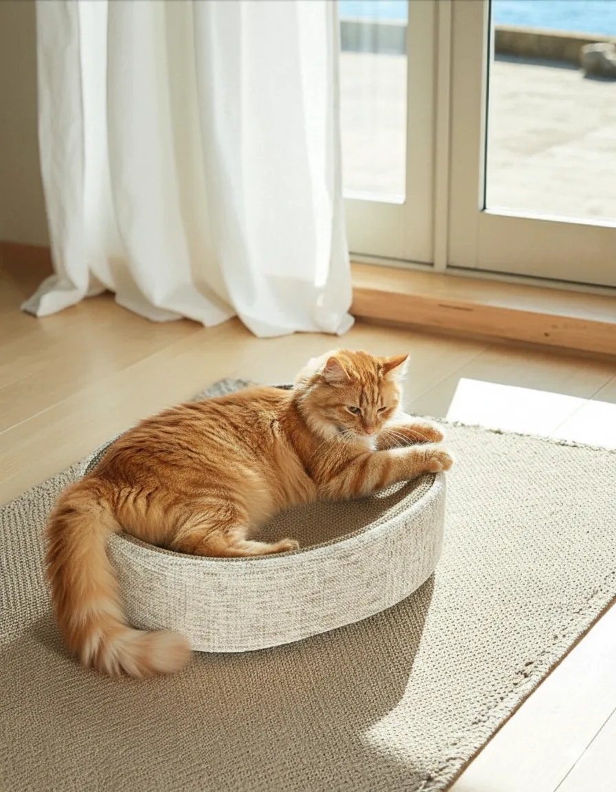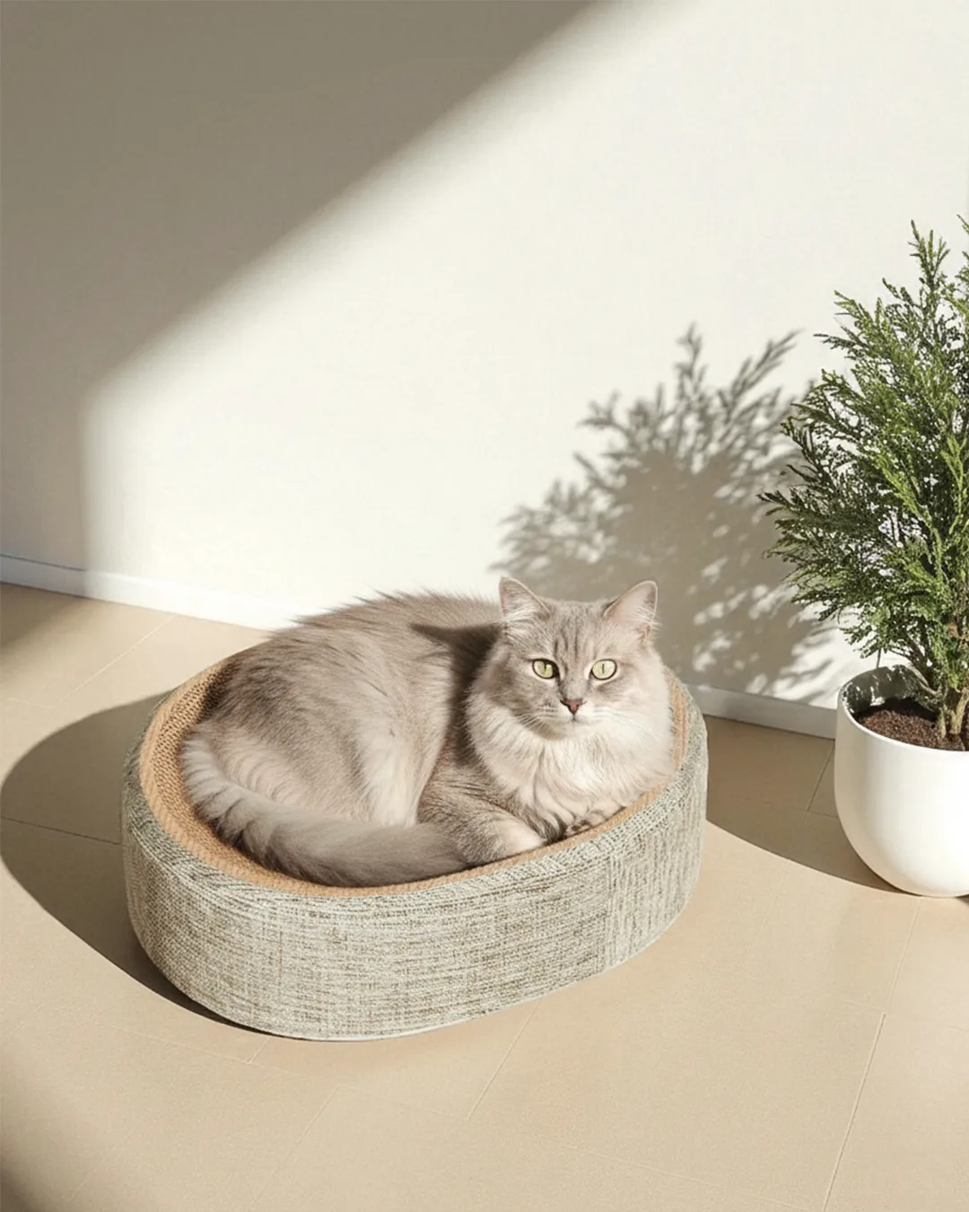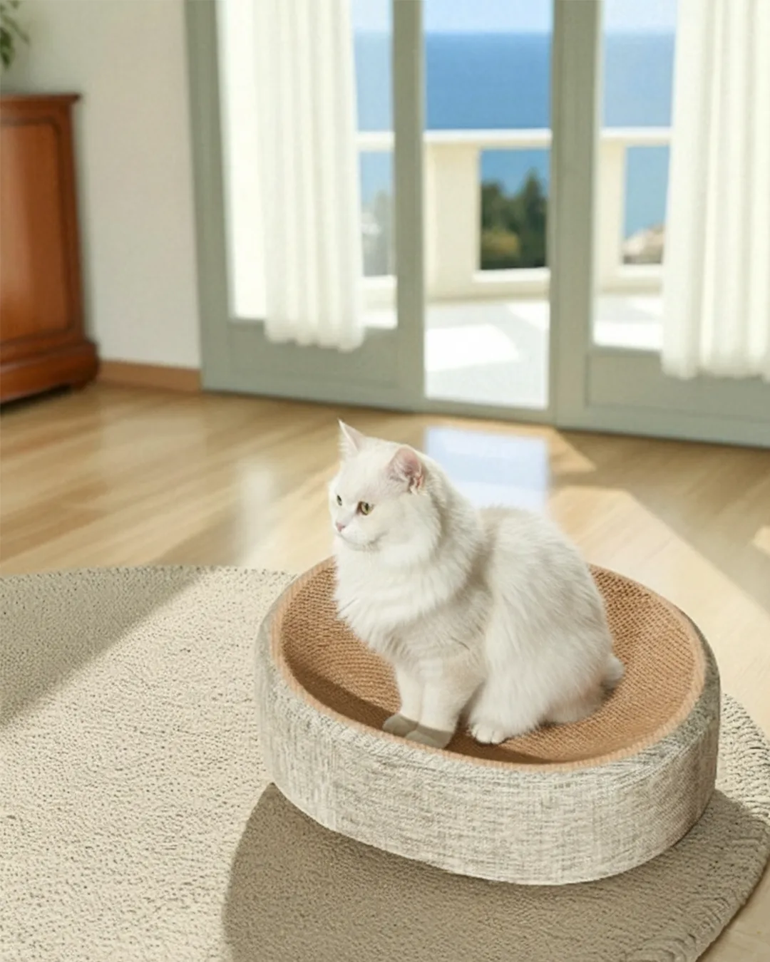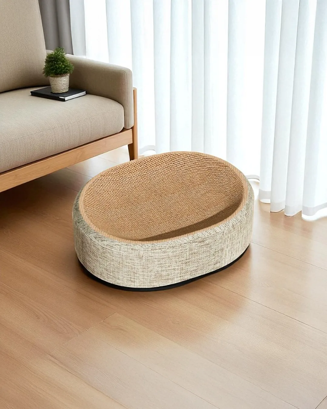 Rascador 2-en-1 que combina superficie de sisal resistente con diseño oval y cóncavo tipo lounge para rascar y descansar en el mismo lugar. La base antideslizante aporta estabilidad incluso en juego activo, mientras que su construcción resistente al desgaste protege tus muebles y cuida las uñas de tu gato.